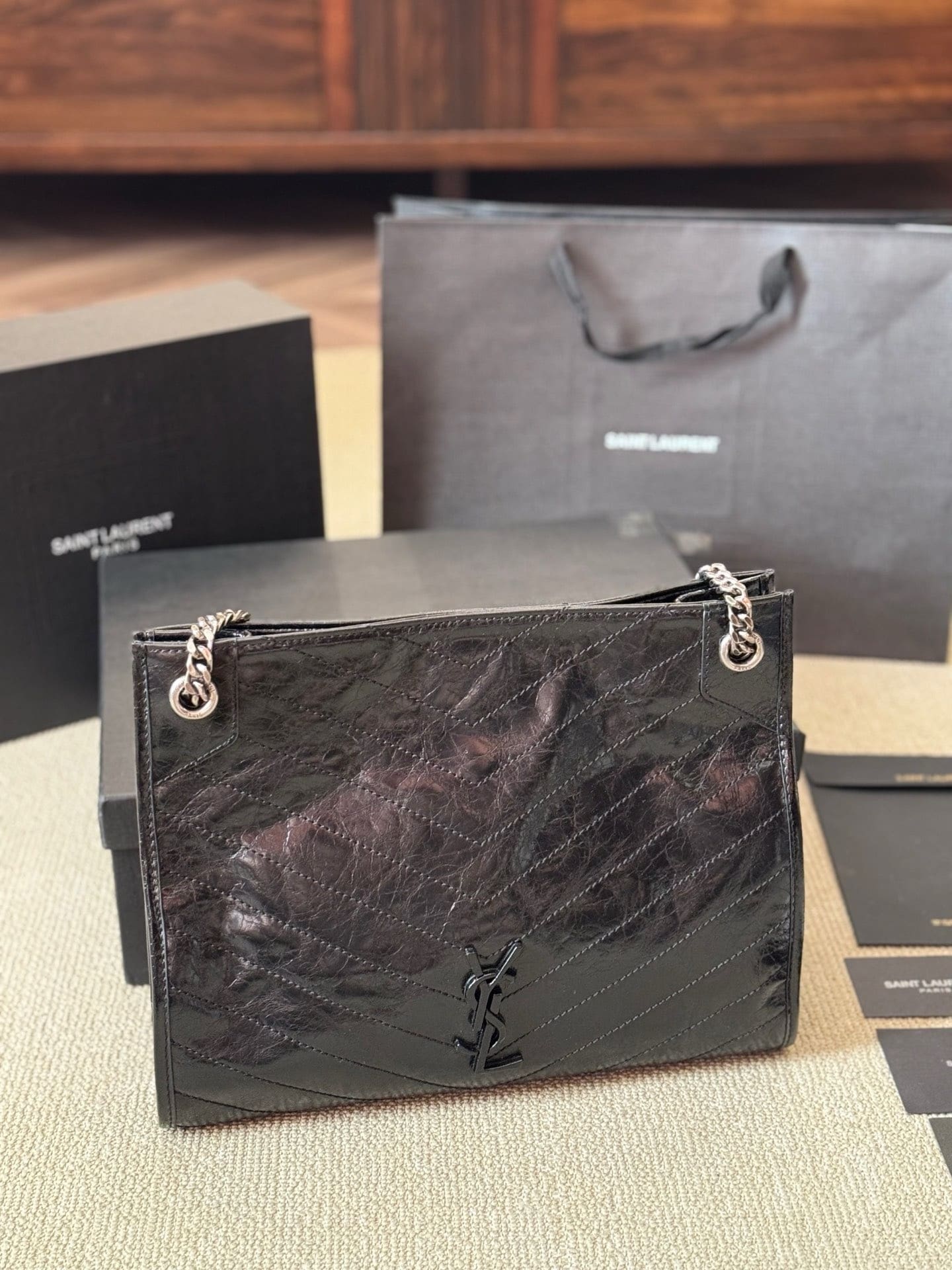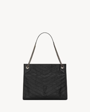 SHOPPING BAG IN VINTAGE CALF LEATHER, FEATURING CHEVRON QUILT OVERSTITCHING AND LEATHER-ENCASED CASSANDRE.