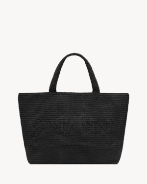 spacious tote bag made with handcrafted raffia crochet, featuring an embroidered SAINT LAURENT signature in tonal raffia.