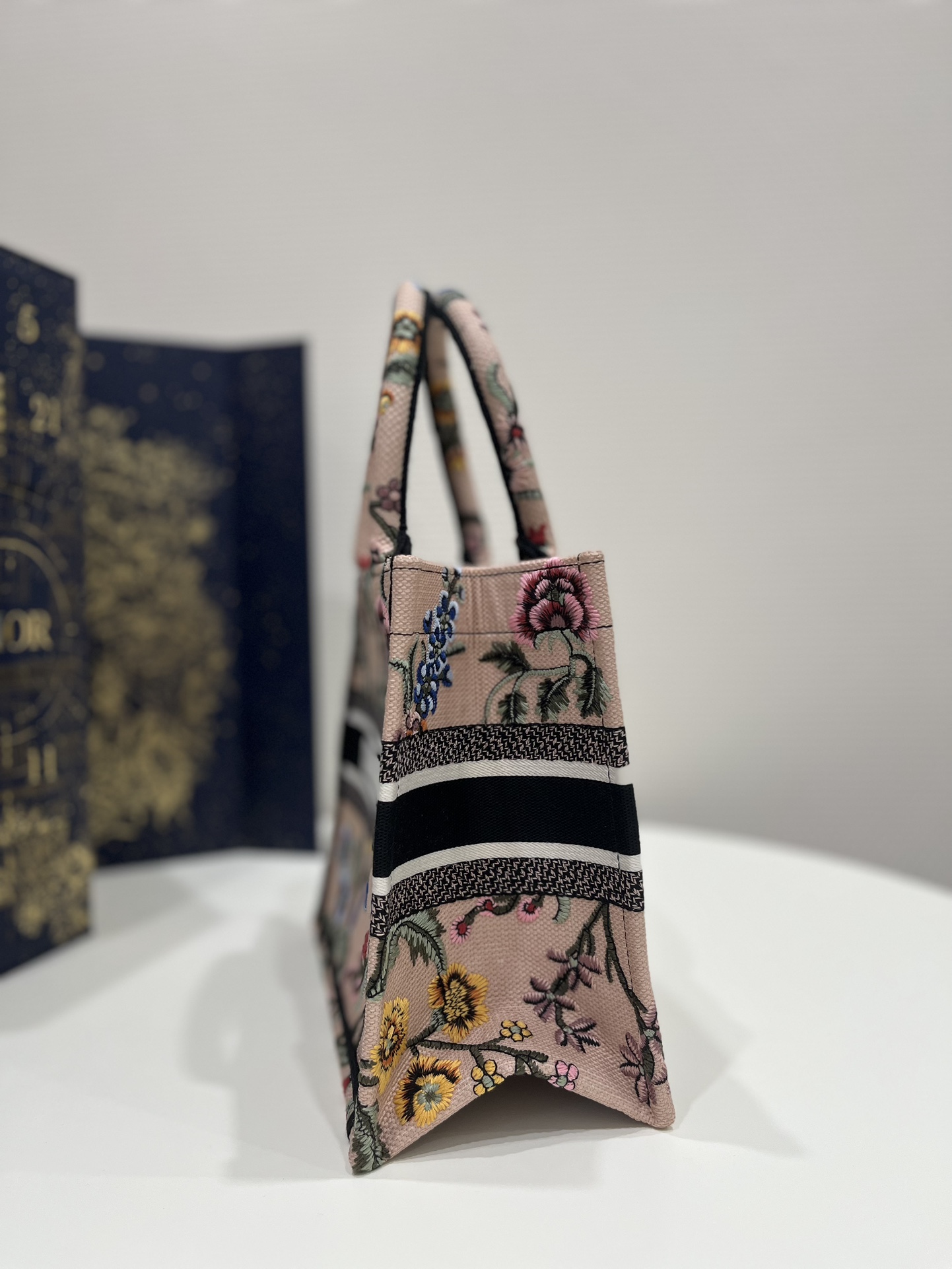 Introduced by Maria Grazia Chiuri, Creative Director of Christian Dior, the Large Dior Book Tote Bag has become a staple of the Dior aesthetic. Designed to hold all daily essentials, the style is fully embroidered with a multicolor Dior Petites Fleurs motif, a romantic and vibrant homage to Mr. Dior’s passion for florals. Adorned with the Christian Dior Paris signature on the front, the small tote exemplifies the House’s signature savoir-faire and may be carried by hand.