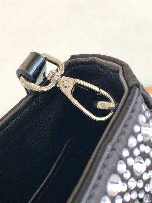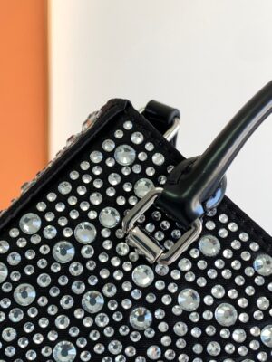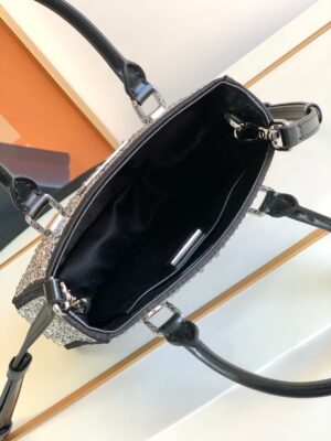 Small Tote Bag With Crystals is this small square tote with a sleek silhouette and contemporary design comes in a luxurious satin version entirely studded with nut that create plays of light and iridescent glimmers on the surface. The accessory, complete with a detachable shoulder strap, can be worn in different ways.