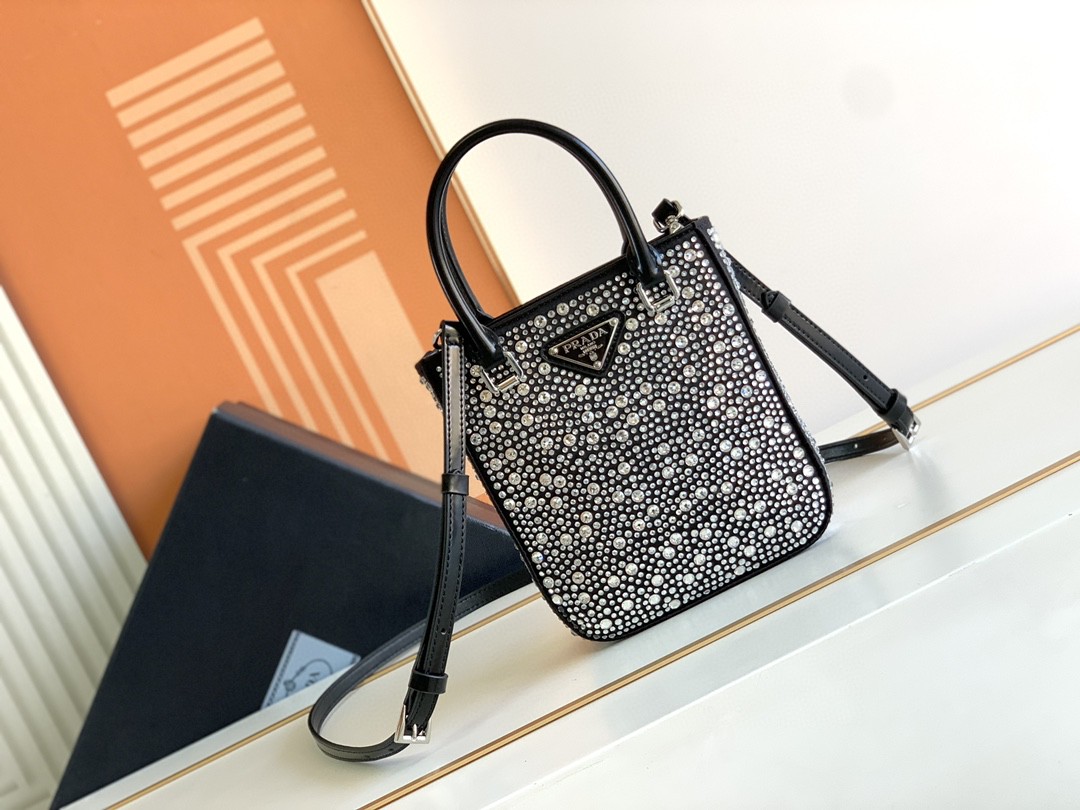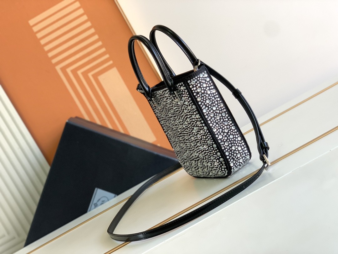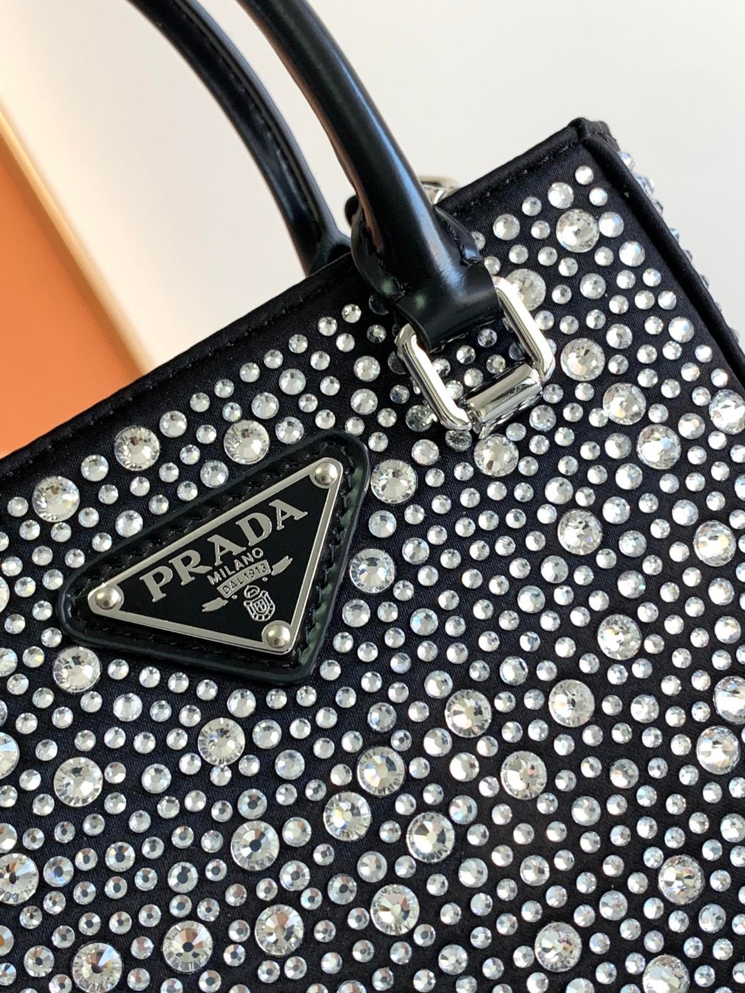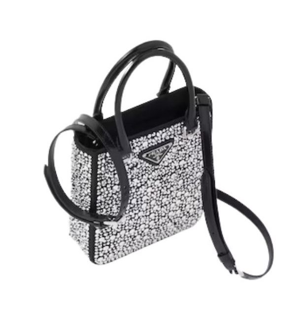 Small Tote Bag With Crystals is this small square tote with a sleek silhouette and contemporary design comes in a luxurious satin version entirely studded with nut that create plays of light and iridescent glimmers on the surface. The accessory, complete with a detachable shoulder strap, can be worn in different ways.