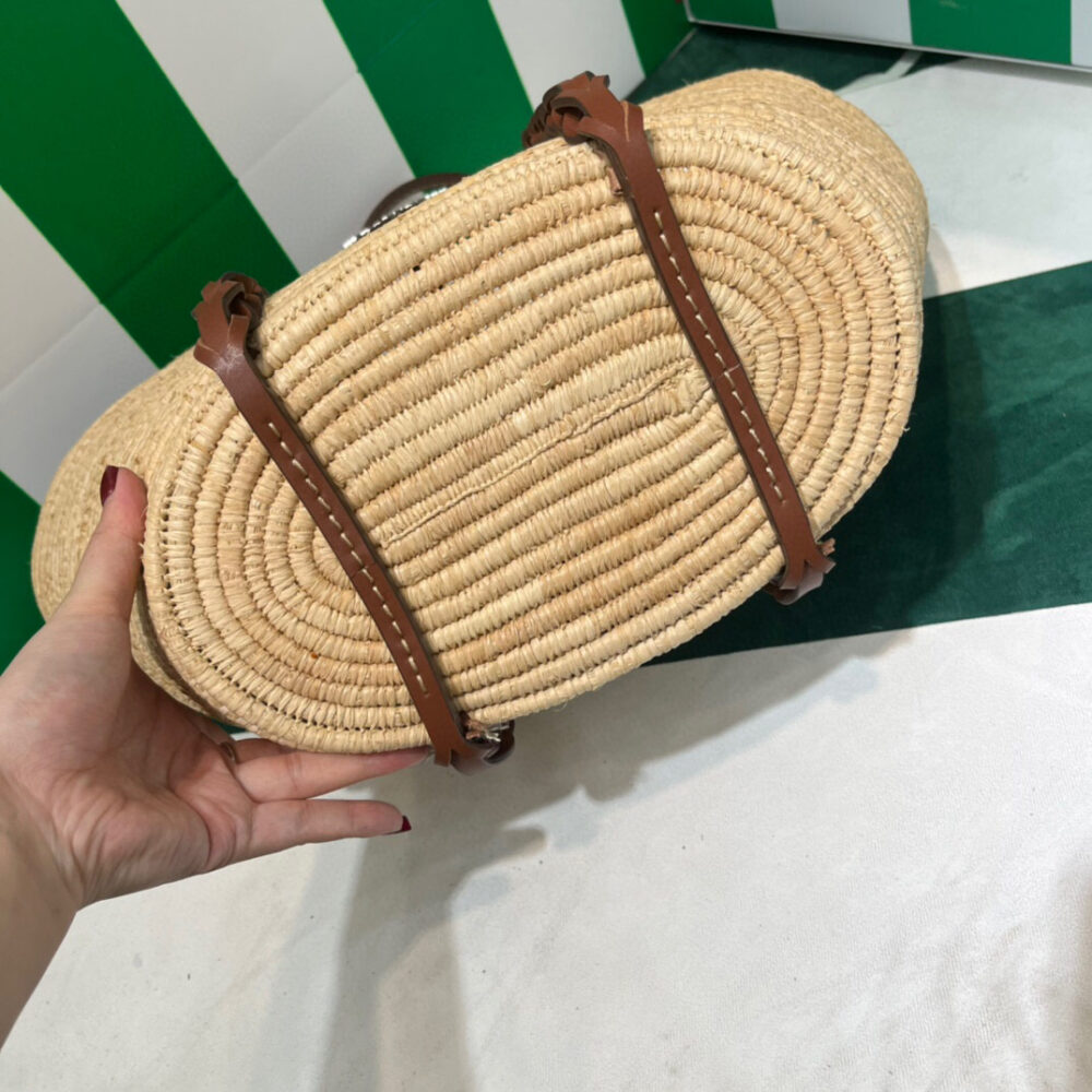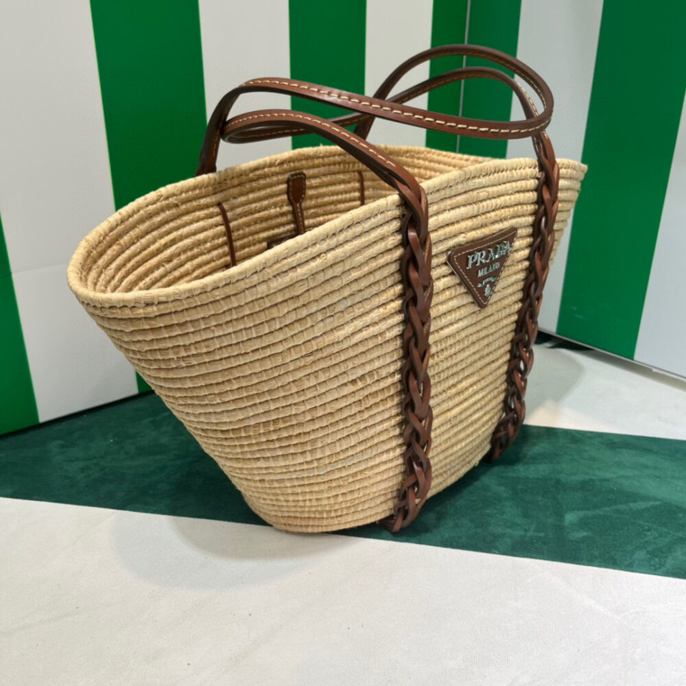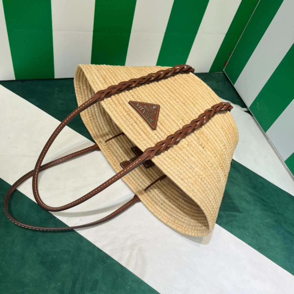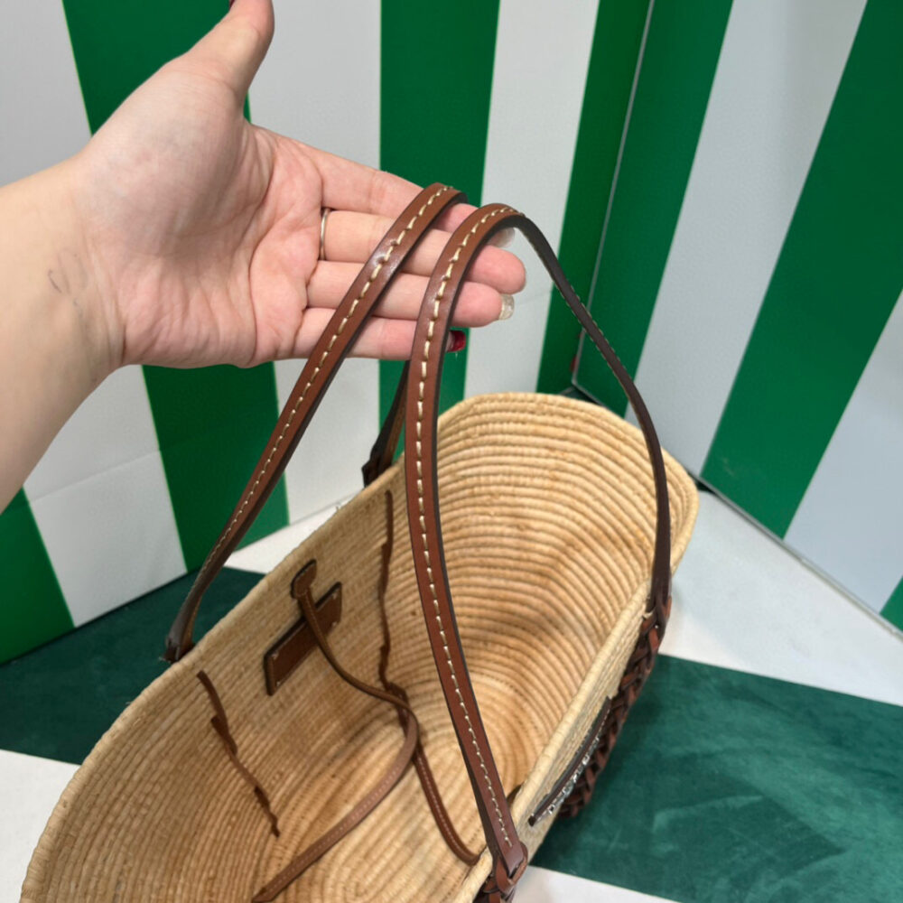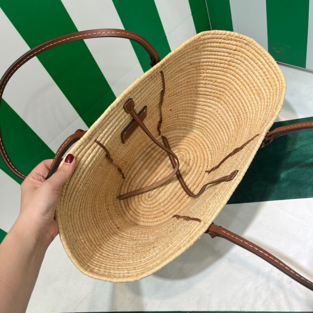 This raffia bag with characteristic basket shape features a distinctive multicolored motif. The braided leather inserts that start at the handles and travel down the bag add a sophisticated touch.