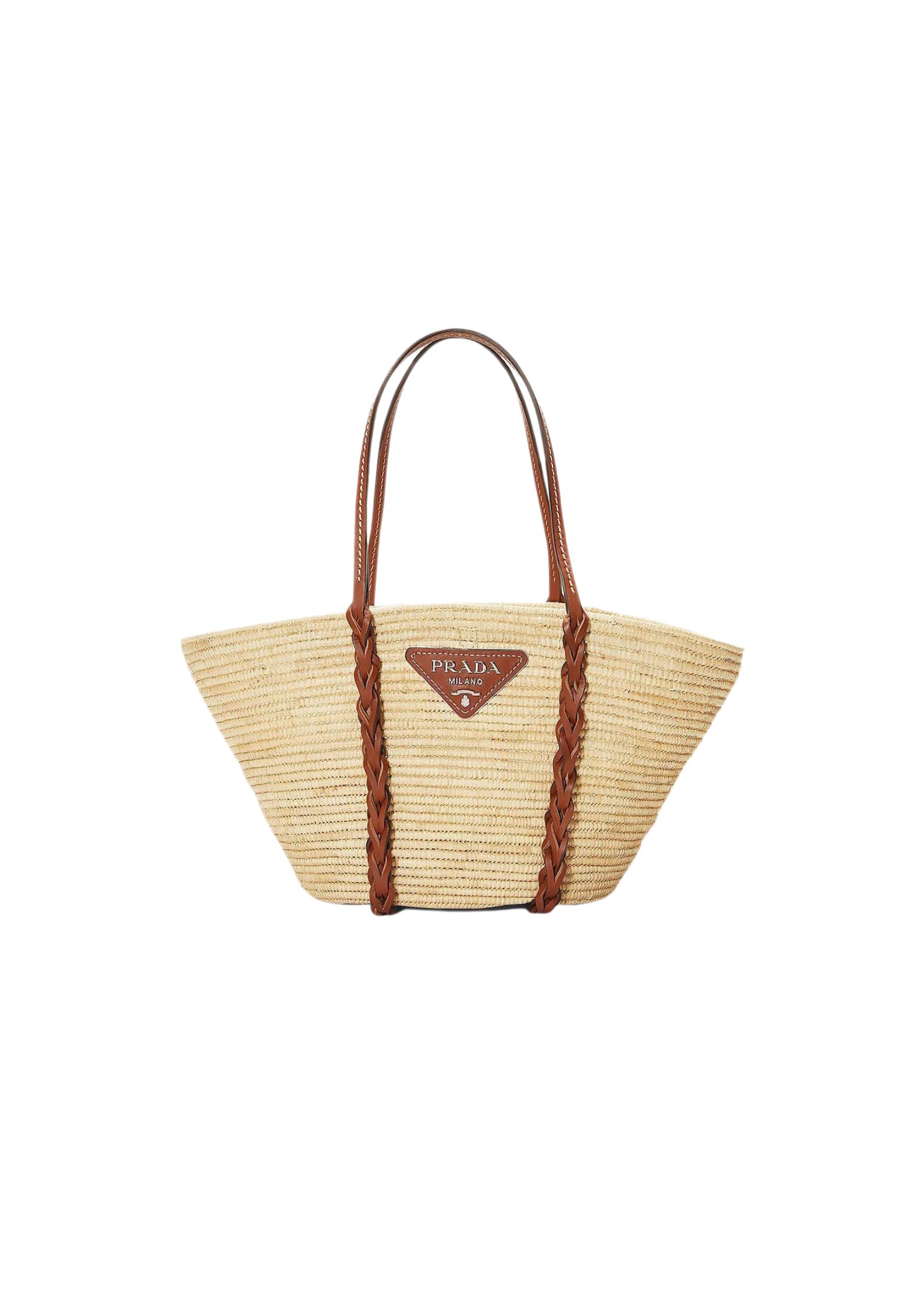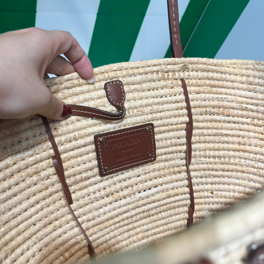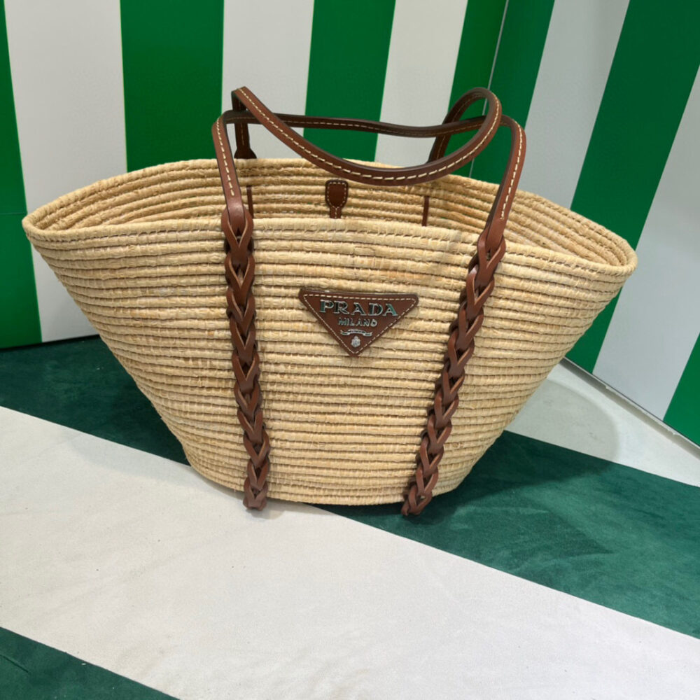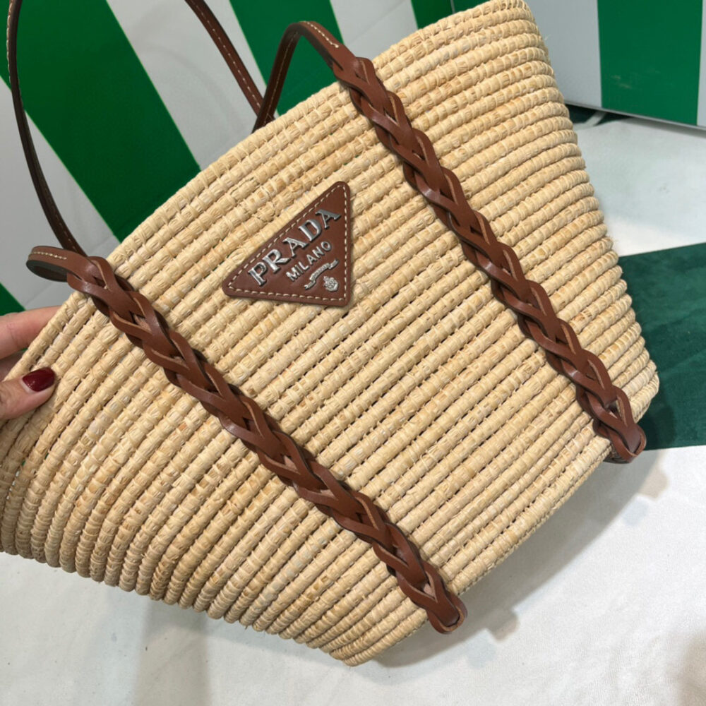 This raffia bag with characteristic basket shape features a distinctive multicolored motif. The braided leather inserts that start at the handles and travel down the bag add a sophisticated touch.